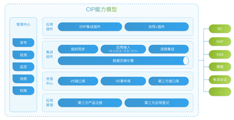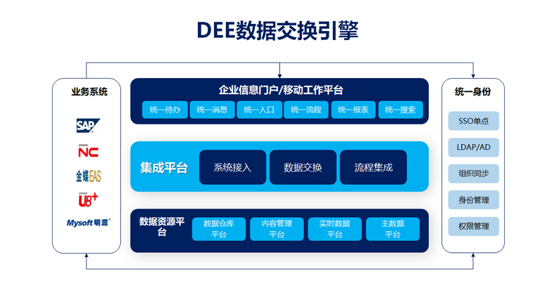 通過(guò)DEE(數(shù)據(jù)交換引擎),實(shí)現(xiàn)V5協(xié)同數(shù)據(jù)與第三方系統(tǒng)(ERP等)的數(shù)據(jù)交換,視化配置方式。