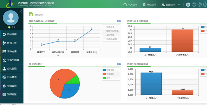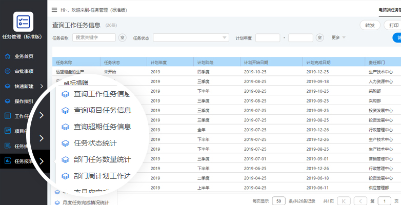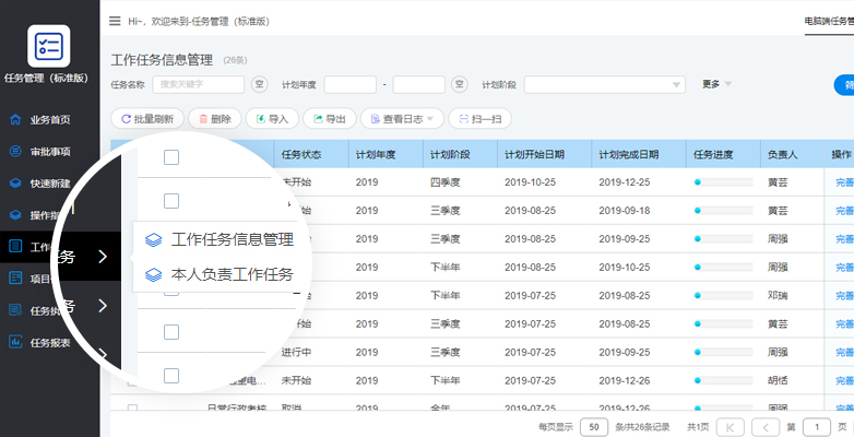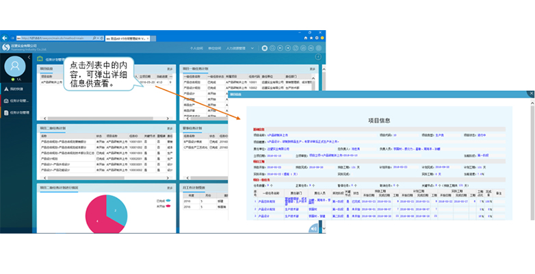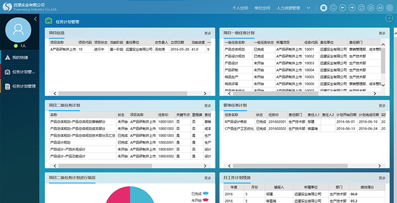 在任務(wù)計(jì)劃管理的空間中,相關(guān)的管理信息數(shù)據(jù)、統(tǒng)計(jì)圖表在一個(gè)頁(yè)面中展現(xiàn),管理者可方便地隨時(shí)查看相關(guān)內(nèi)容。