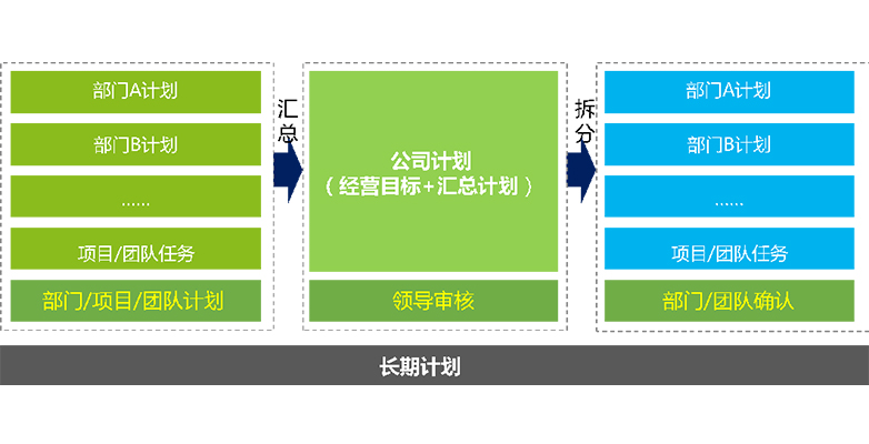支持對(duì)戰(zhàn)略規(guī)劃的分解執(zhí)行。戰(zhàn)略規(guī)劃在時(shí)間緯度、組織緯度、目標(biāo)內(nèi)容緯度形成了三維模型。