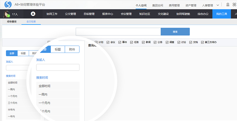 可查看/自定義全文檢索:可篩選協(xié)同、表單、公文、計(jì)劃、會(huì)議等,也可按發(fā)起人、搜索時(shí)間、起止時(shí)間、熱門(mén)搜索進(jìn)行相關(guān)搜索。
