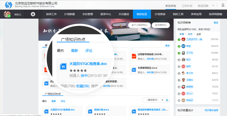 在知識(shí)廣場(chǎng)可查看單位學(xué)習(xí)區(qū)、廣場(chǎng)知識(shí)熱點(diǎn)、知識(shí)貢獻(xiàn)榜、知識(shí)容量統(tǒng)計(jì)。